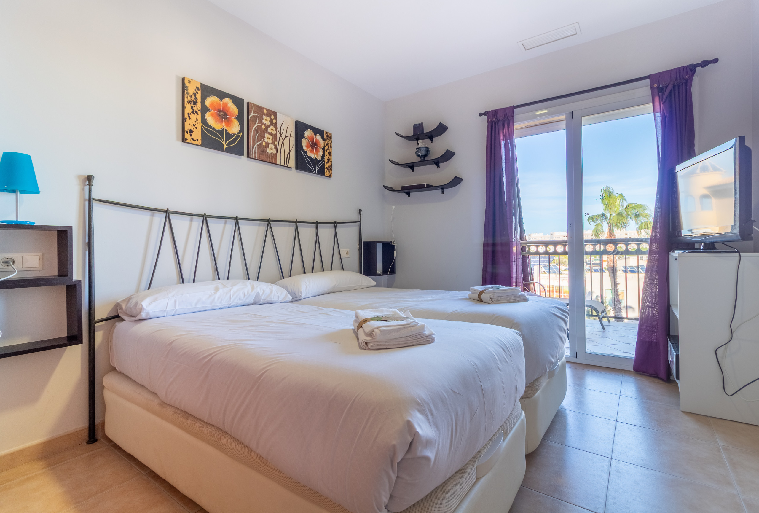 El apartamento cuenta con dos dormitorios equipados con 4 camas individuales, ideal para maximizar la flexibilidad de descanso. Dispone de un amplio salón con dos televisores y una cocina americana completamente equipada que incluye electrodomésticos como nevera, congelador, lavavajillas, microondas, horno, cafetera, tostadora y menaje completo.