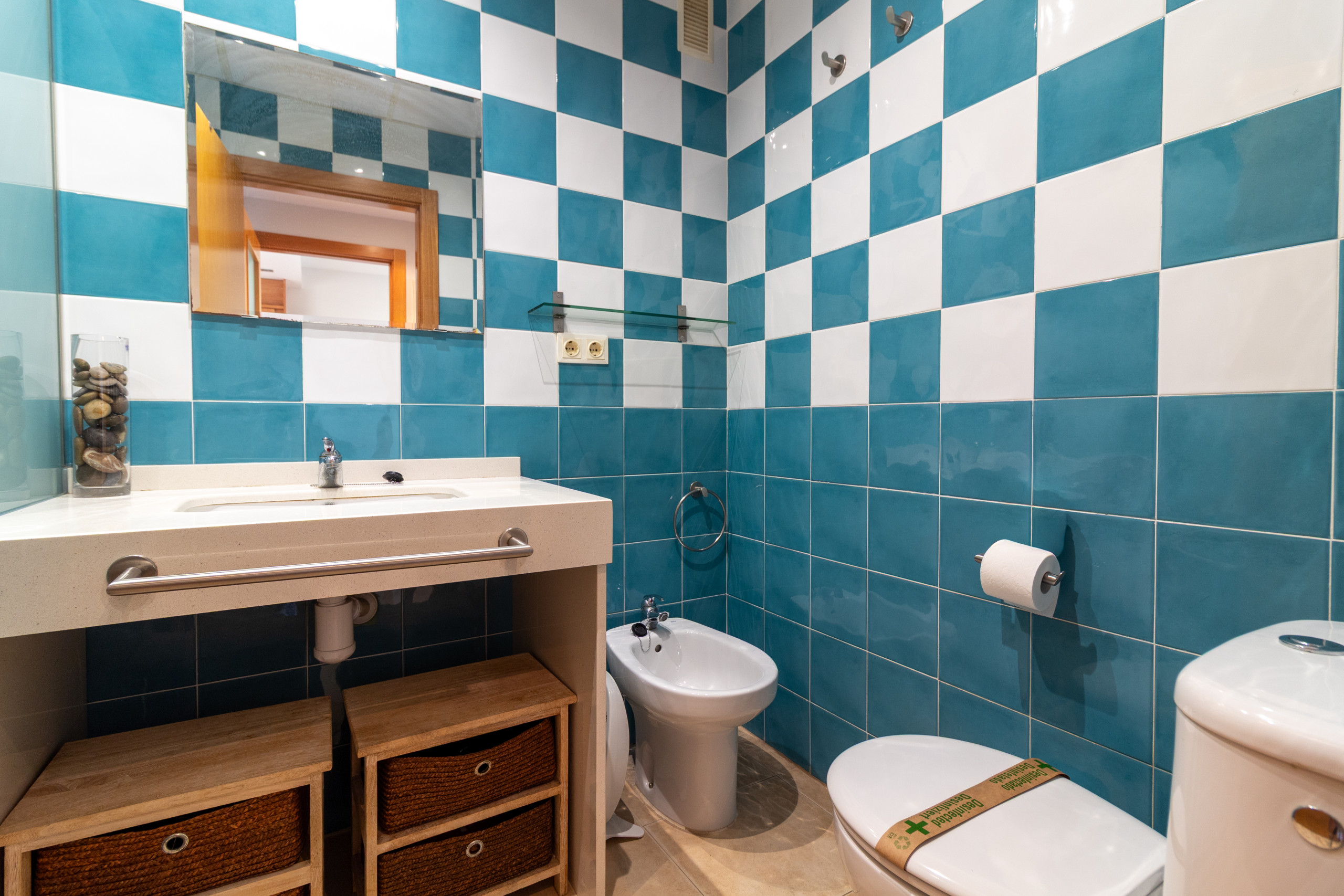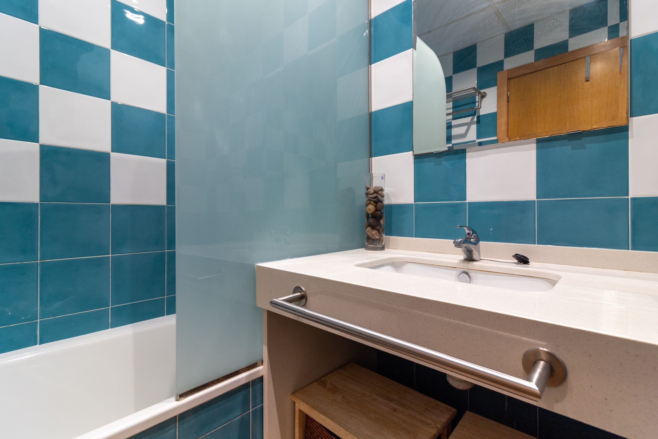 El baño principal cuenta con bañera, y el apartamento está climatizado con aire acondicionado y bomba de calor para garantizar tu confort en cualquier época del año. Además, incluye servicios prácticos como plancha y lavadora.