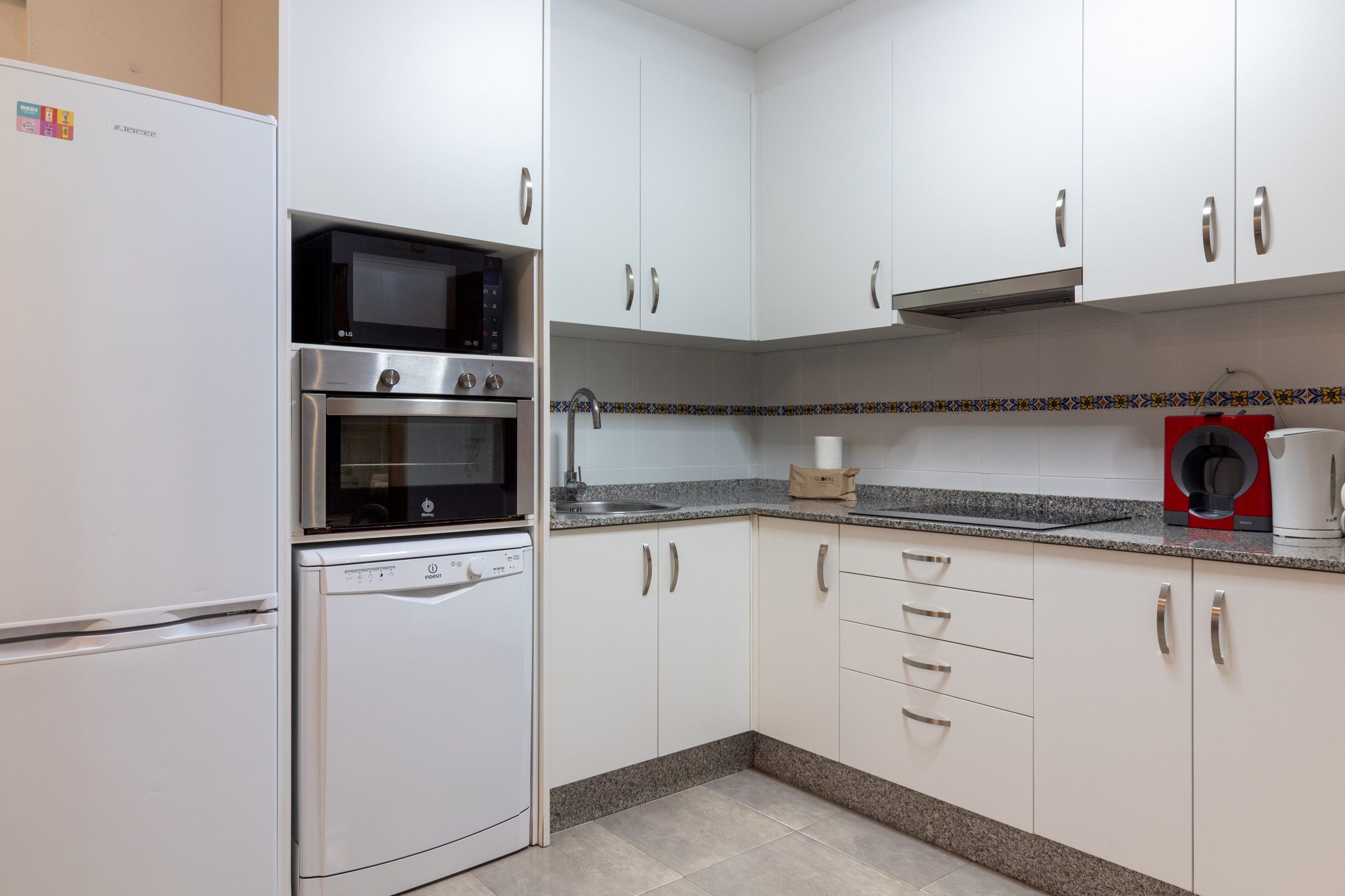 In the hotplate of glass ceramics open plan kitchen, refrigerator, microwave, oven, freezer, dishwasher, dishes/cutlery, kitchen utensils, coffee machine, toaster and juicer are provided.