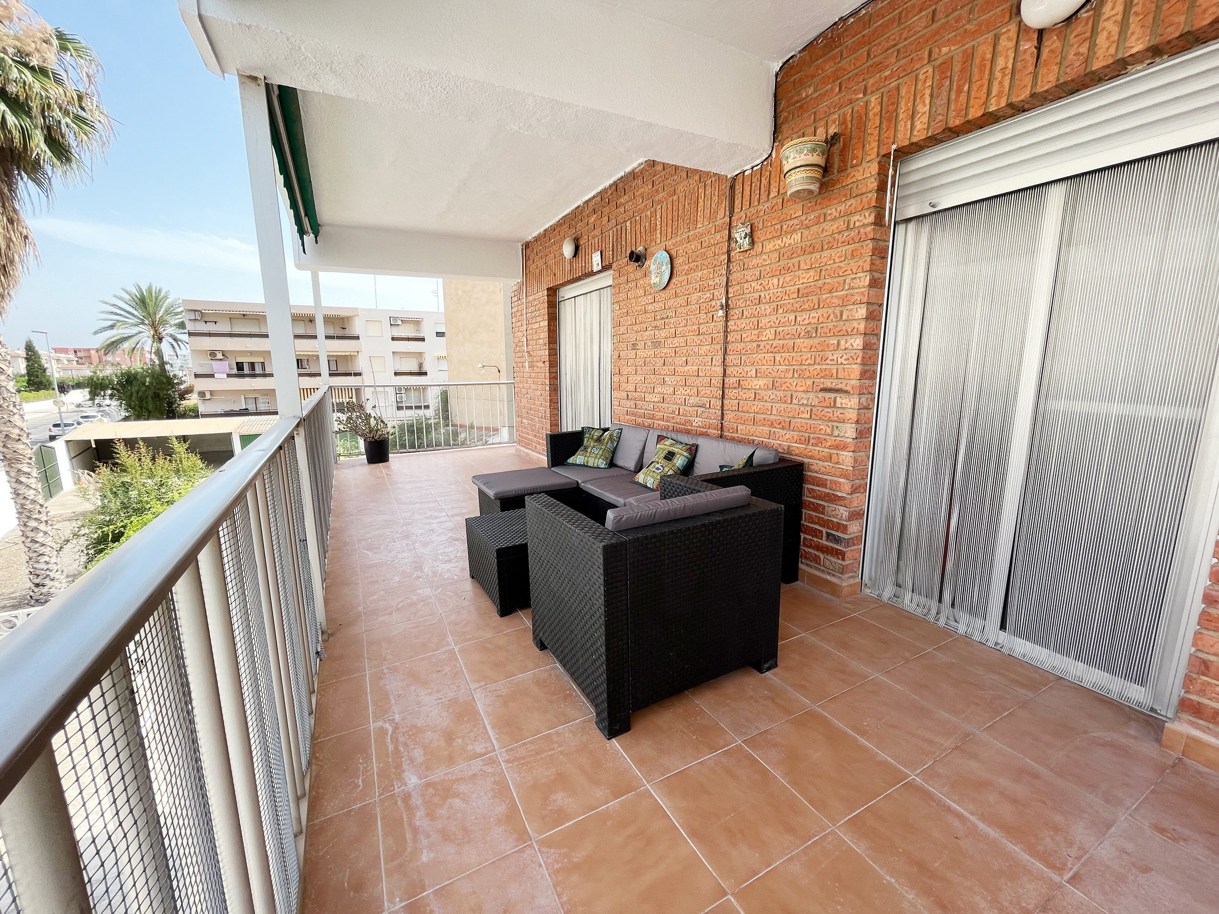 - The living room is spacious and practical, with direct access to the large terrace.