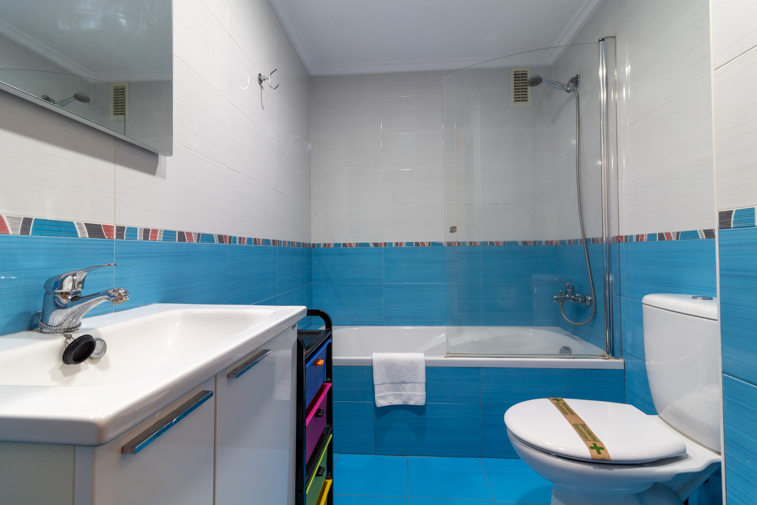 The apartment has two bedrooms with a versatile layout: a double bed, a bunk bed, and a sofa bed, which allows for a flexible configuration for different types of travellers. It has a single full bathroom with a bathtub, ideal for resting after a day of activities.